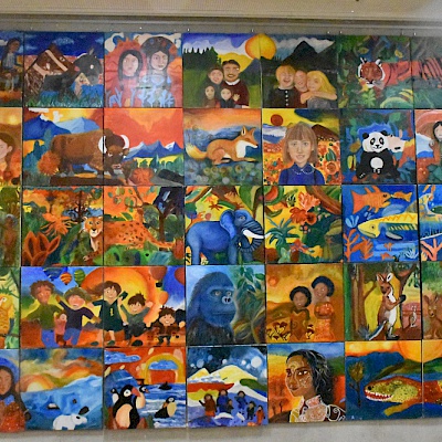 Zwei Jahre lang malten die Schüler/innen unter der Leitung der Dipl. Kommunikationsdesignerin Frau Alfaro Gamarra de Johannsen n und der damaligen Leitung der GTS, Frau Lineal-Valet, an dem Werk. Dabei setzten sich die teilnehmenden Grundschüler/innen in einem künstlerischen Prozess intensiv mit der Visualisierung des Leitbildes der Eichendorffschule "Miteinander leben lernen " auseinander.